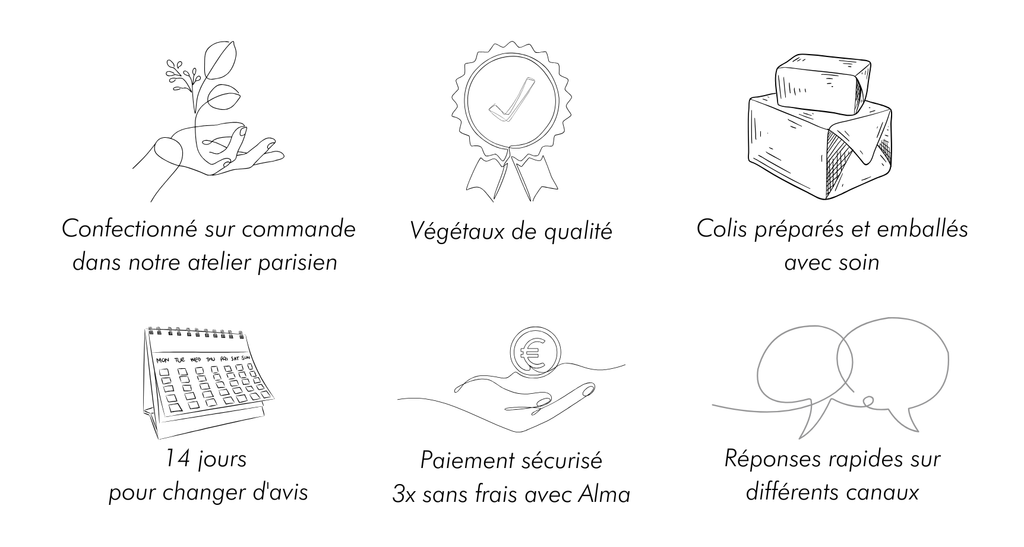 - Exceptions : créations sur mesure, lettres, décorations murales, gamme mariage.