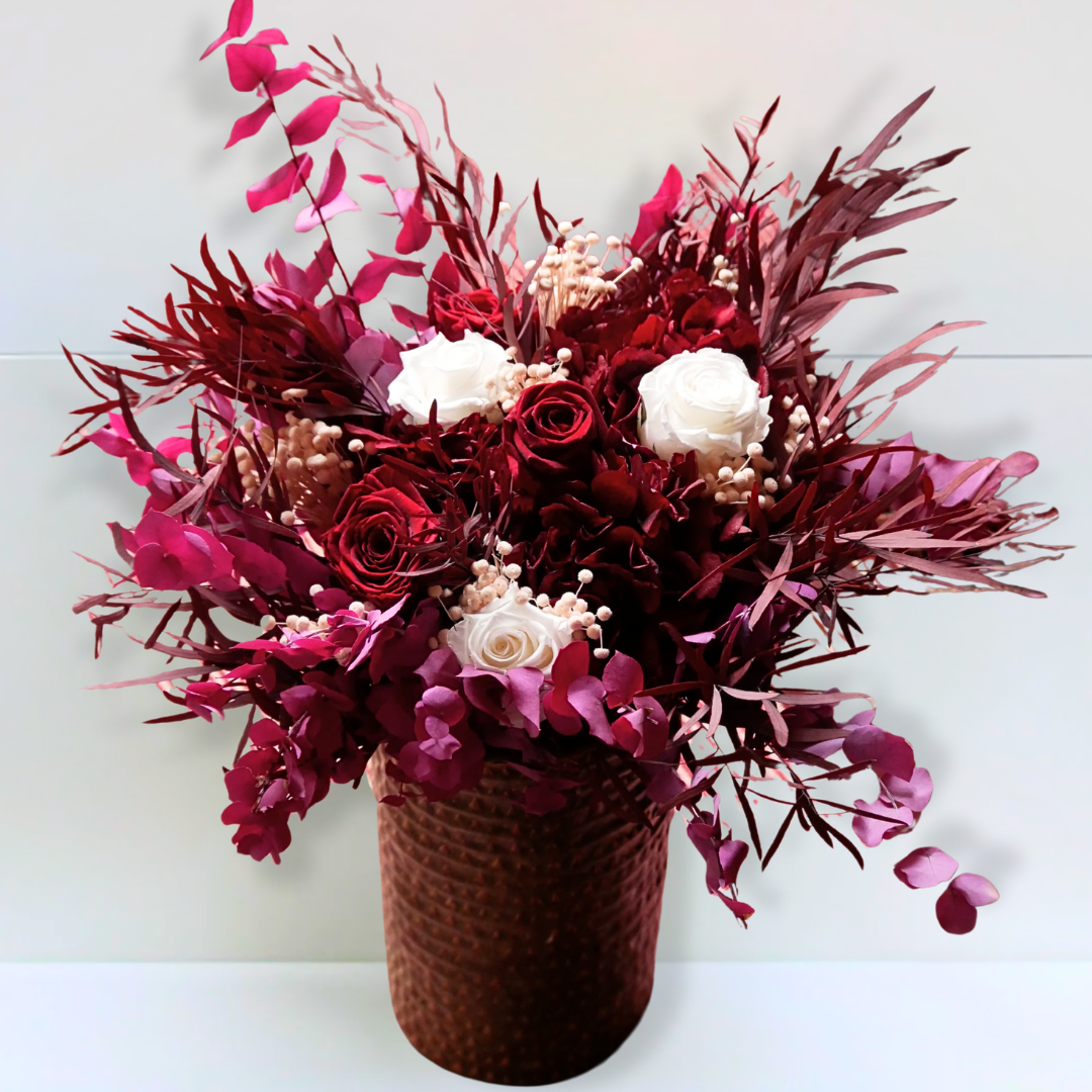 Offrez une attention forte en émotion avec ce bouquet de fleurs stabilisées aux nuances bordeaux profond et rose délicat.
